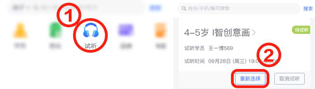 试听学员因特殊情况无法参与,可在 前台-试听 重新选择试听。