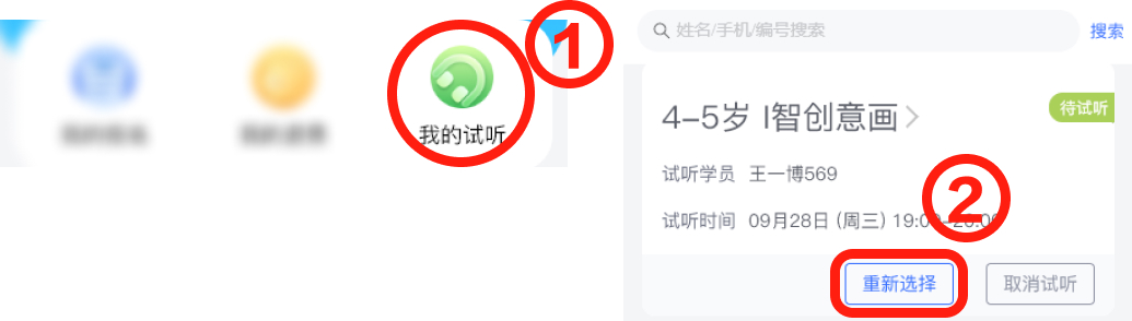 试听学员因特殊情况想更换课程或者时间,若无前台权限,可在 我的试听 重新选择。但我的试听仅可看到自己预约的试听。