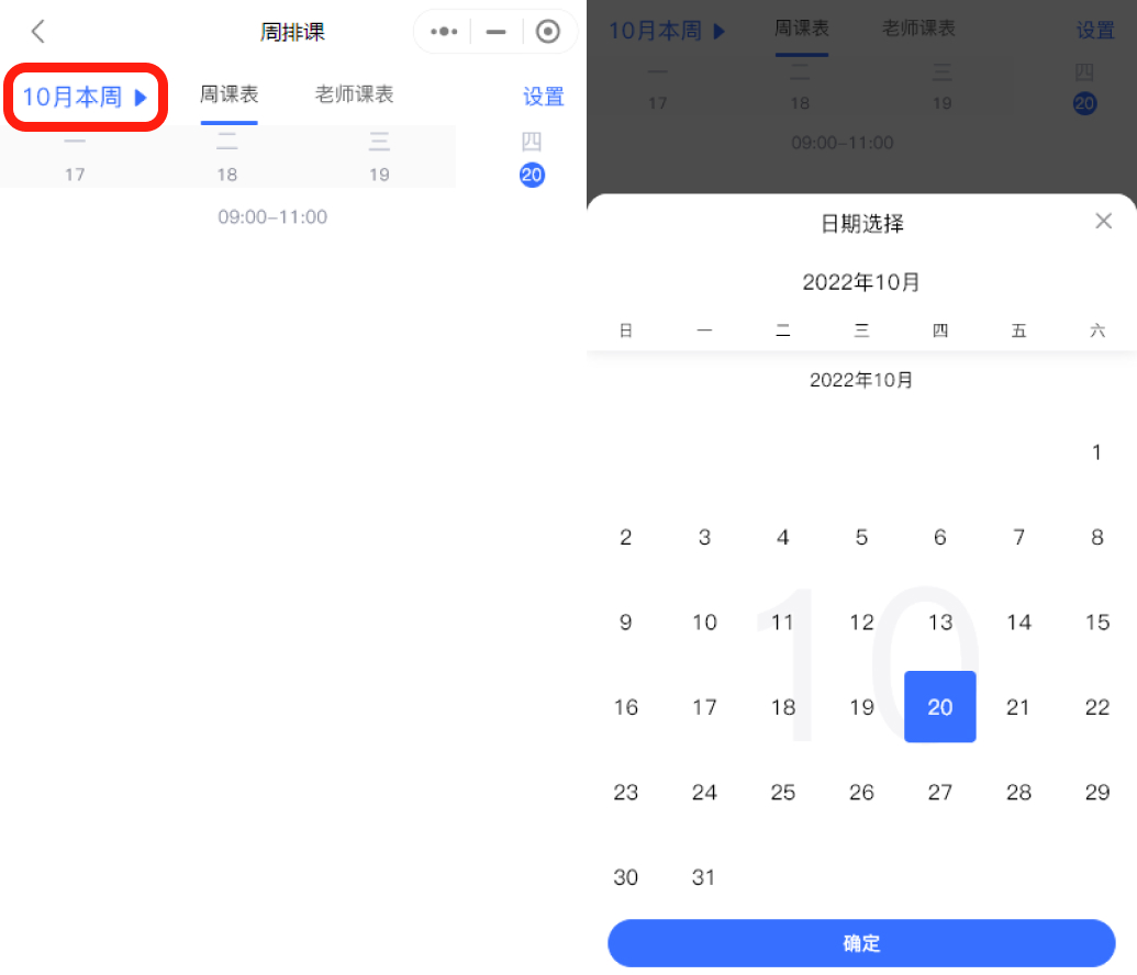课表左上角 为当前排课时间,如 10月本周点击