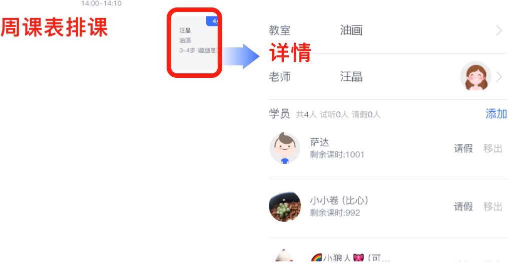 点击想要查看时间段的课表格子,进入到该课堂详情。