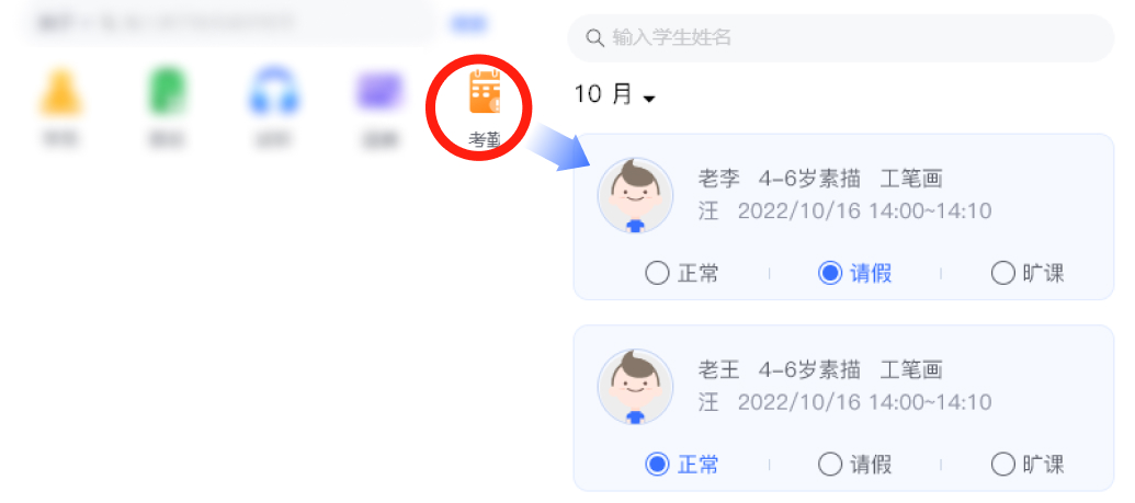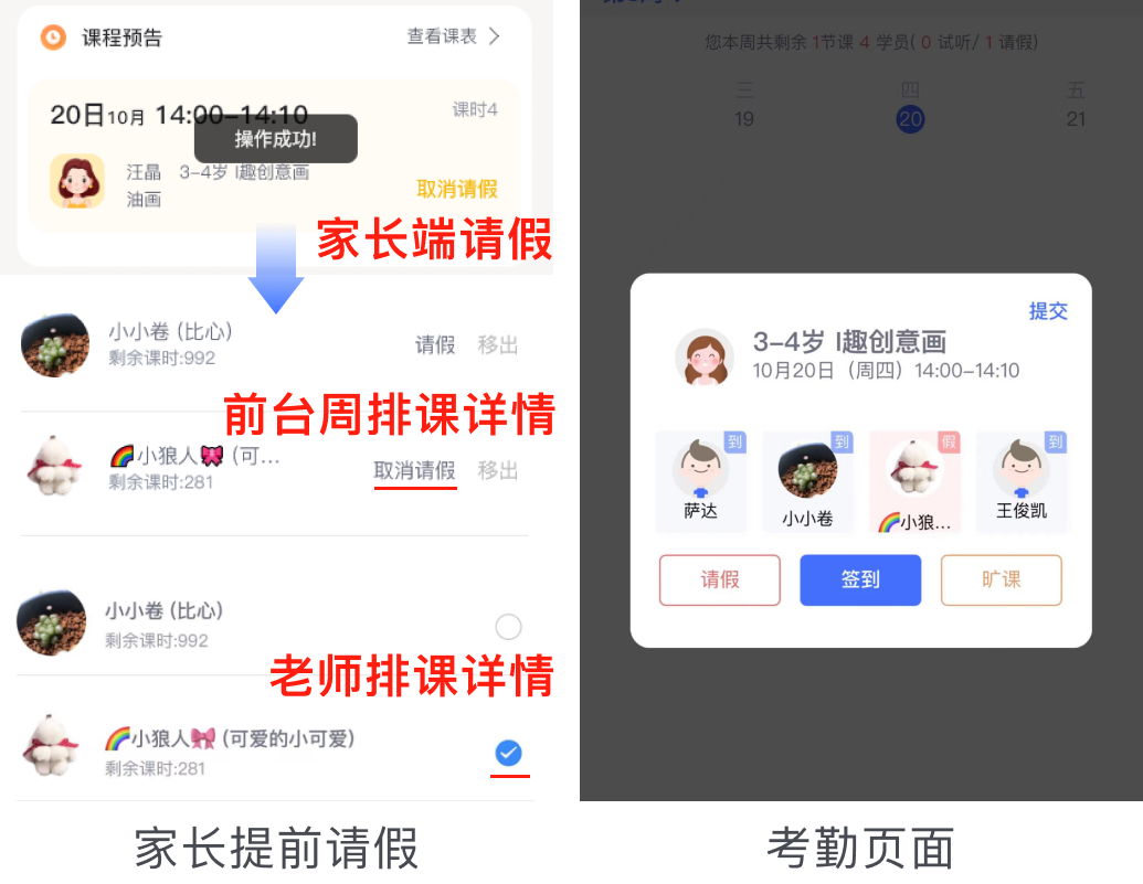 上课开始时间30分钟内可以开始考勤(如 家长提前在家长版请假,会显示请假)