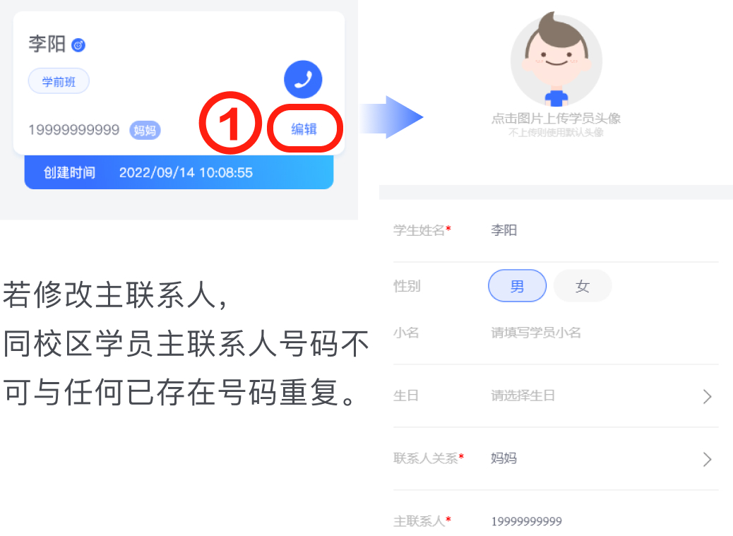 从学员列表选择需要修改的学员,点击进入详情,点击学员详情卡片上的编辑。